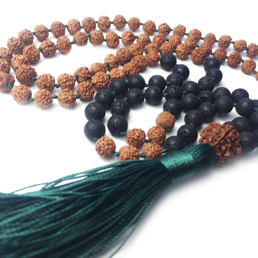This mala necklace is hand knotted with 108 beads made of rudraksha seeds and igneous rock from cooled magma lava. For on-the-go aromatherapy, the beads of this necklace are porous and can be dipped in essential oils. They will hold a scent for 1-2 days when using non-diluted pure essential oils.
